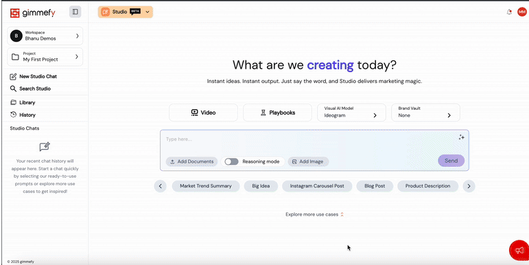 Studio: Create Viral Content with AI-Powered Precision Studio Overview Studio is your all-in-one creative workspace in gimmefy: Instantly create content, conduct research, generate visuals & videos, and manage brand consistency—all in one place. ...